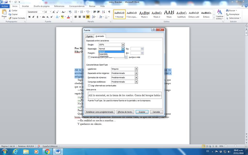 Para apretar o expandir un poco los espacios entre los caracteres podemos seleccionar una parte del texto, ir a la opción «fuente» (que aparece en la parte superior de Word) y en la cajita de «espaciado» tenemos las opciones «normal», «comprimido» y «espaciado», como se muestra en la segunda imagen. Jugaremos con los valores, cuidando que los caracteres no queden muy apretados (generalmente basta aplicar un 0.6 o 0.7) o, en su defecto, muy separados.