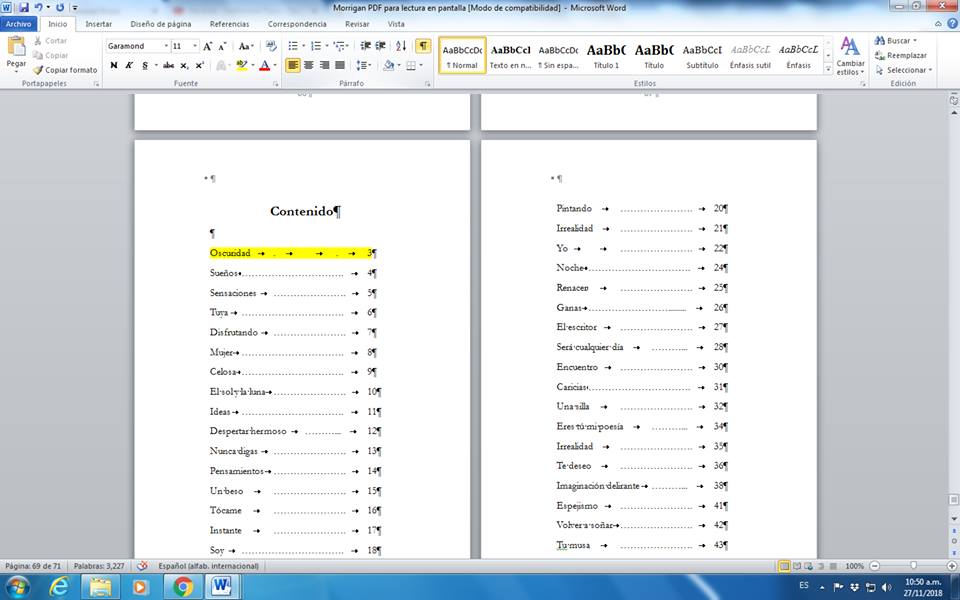 Escribimos el título del poema o del relato, pulsamos una vez la tecla tab y ponemos un punto, pulsamos otra vez la barra tab y ponemos un punto, volvemos a pulsar la barra tab y ponemos un número de página (veremos cuántas páginas tiene nuestro documento y si necesitamos tres caracteres, por ejemplo si nuestro documento tiene 600 páginas, ponemos desde el principio tres números, que luego modificaremos).